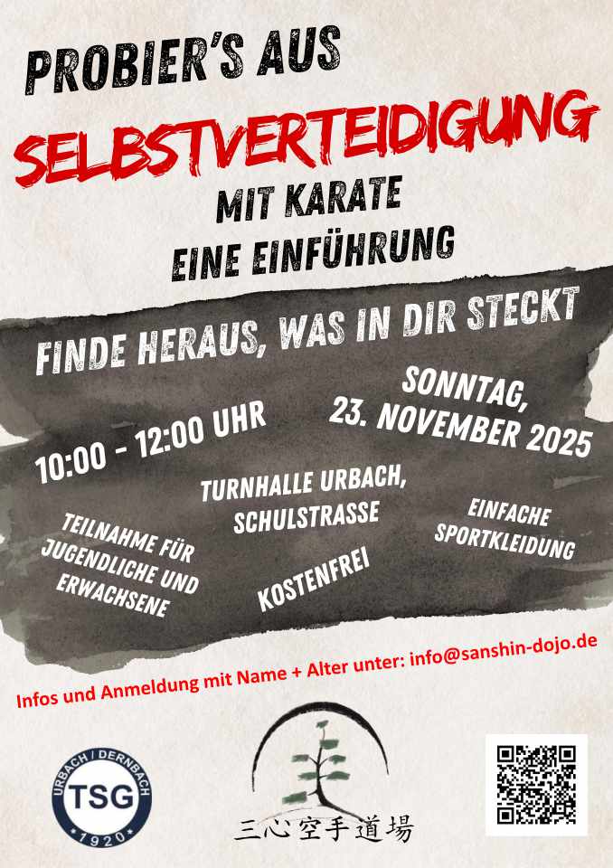 Mehr Selbstvertrauen, mehr Sicherheit, mehr Achtsamkeit: Die Karateabteilung der TSG Urbach Dernbach e.V. lädt am 23.11.2025 zu einer ersten Einführung in die Selbstverteidigung ein, die auf den bewährten Prinzipien der traditionellen Kampfkunst Karate aufbaut. Der Kurs richtet sich sowohl an Jugendliche ab 14 Jahren und Erwachsene, die lernen möchten, sich in schwierigen Situationen richtig zu verhalten und selbstbewusst aufzutreten – unabhängig von Alter, Geschlecht oder Fitnesslevel.